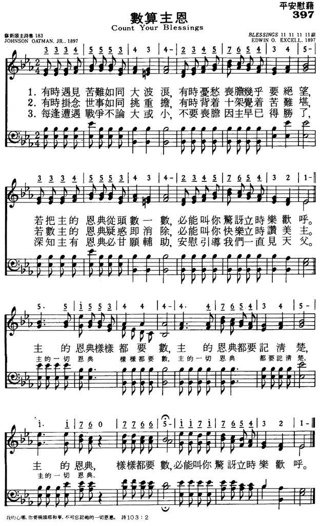 作者欧德曼(Johnson Oatman, Jr. 1856-1922)出生于新泽西州,他的父亲常在教会献诗,因此他从小就熟谙圣诗。 十九岁时受卫理公会按牧,但牧会经验不多。 早年他随父经营家业,父亲去世后,他从事保险业而不断晋升。 1892年,他开始写福音诗歌,《数算主恩》写于1897年,他发觉许多人疏忽了 神的恩典,因此提醒信徒们,要将主恩细数并记清楚,这样在奔走天路时,就能如鹰展翼飞翔高空。 他一共写了五千多首圣诗,在十九世纪末廿世纪初的福音诗写作上,占重要一席。 他的作品,我们常唱的有《那有朋友像耶稣》(No, Not One),《向高处行》(Higher Ground ),《无朋友待我像耶稣》(There’s No Friend Like Jesus)等。