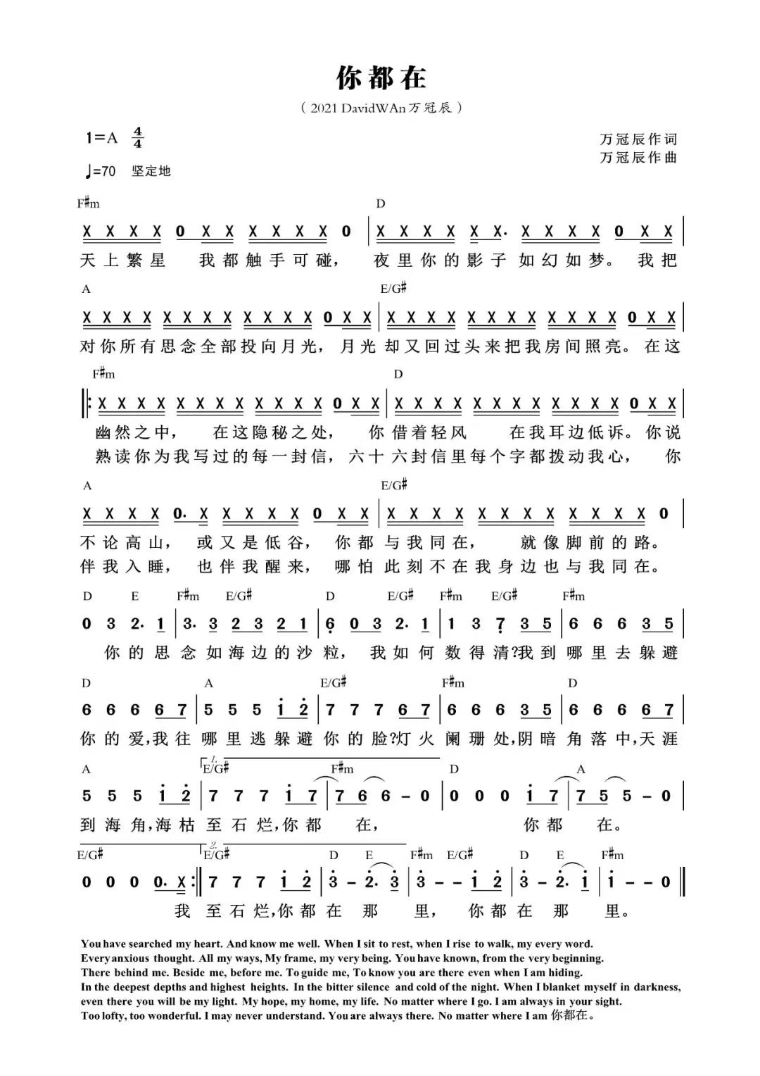 You have searched my heart,And know me well. When I sit to rest, when l rise to walk, my every word. Every anxious thought, All my ways, My frame, my very being, You have known, from the very beginning. There behind me. Beside me, before me. To guide me, To know you are there even when I am hiding.In the deepest depths and highest heights, In the bitter silence and cold of the night. When I blanket myself in darkness, even there you will be my light,My hope,my home,my life. No matter where i go, l am always in your sight. Too lofty, too wonderful, I may never understand. You are always there,No matter where l am 你都在。