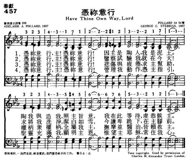1902年包爱德拟去非洲传道,但募款无着,十分沮丧与灰心,灵性陷入低潮。一晚她参加一祈祷会,听到一位年长的姊妹祷告说:“主阿!不论你如何安排我的一切,但求你的旨意在我身上成全。”她听了大受感动,回家后,依据以赛亚书64:8耶和华啊,我们是泥,你是窑匠,我们都是你手的工作。写下了这首诗。