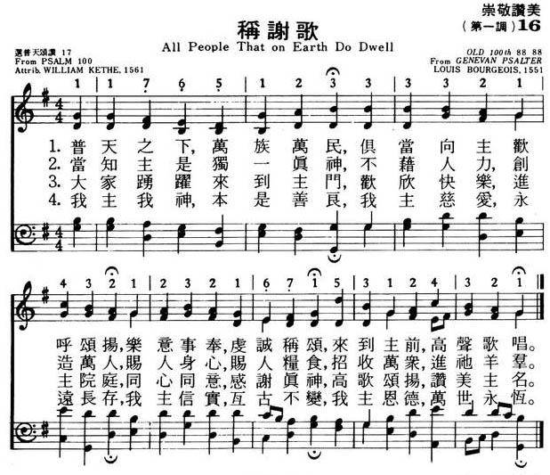 《称谢歌》的词,是在基督教新教中最通用、最受人喜爱的赞美诗之一,它的作者基思(W.Kethe,约卒于1594年),于1561用韵文译的诗篇第100篇,写成这首诗,是迄今通用英语韵文诗篇中最早的一版,原稿还珍藏于英国皇家博物馆。