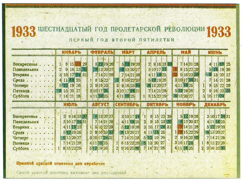 上图:1930年一周5天的苏维埃历法(Soviet Calendar)。俄国十月革命以后,为了消除基督教的影响,前苏联于1929-1930年实施一周5天制,1931年改成一周6天制,造成极大混乱。1940年不得不废除苏维埃历法。恢复成一周7天制。
