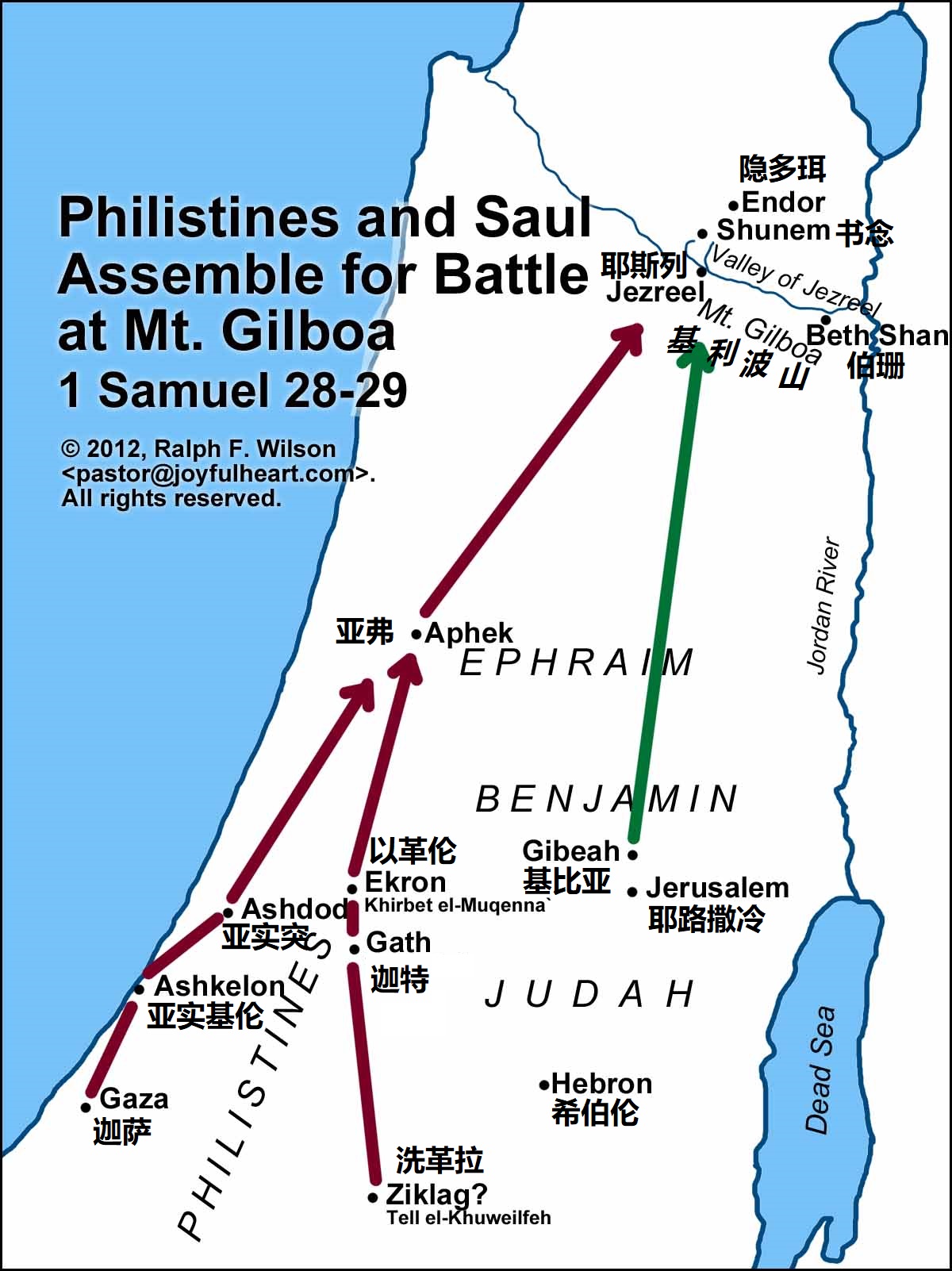 - 「基利波山」(1节)位于耶斯列平原的东南边,是应许之地的腹地。非利士人原来居住在地中海沿岸,现在却北上深入基利波山,可以在平原地带发挥战车的优势,切断以色列的南北交通,占据全国最肥沃的平原地带。