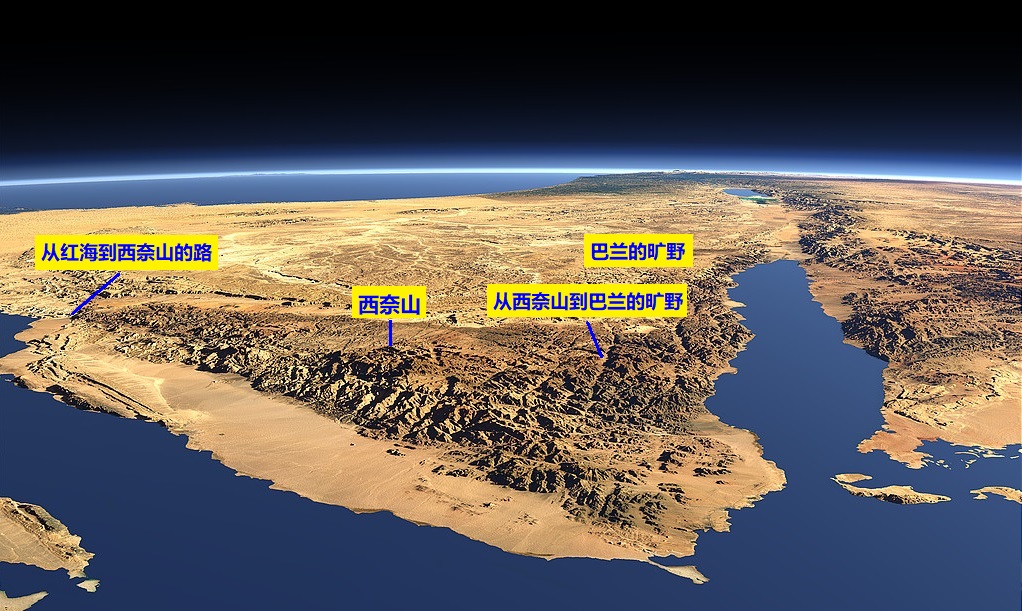 上图:从红海到西奈山,大部分的道路都沿着红海附近,比较平坦,到了西奈的旷野才进入高原丘陵地区。但从西奈的旷野到巴兰的旷野,一路沟壑纵横、崎岖不平,比从红海到西奈山的道路更难走,被称为「大而可怕的旷野」(申一19)。