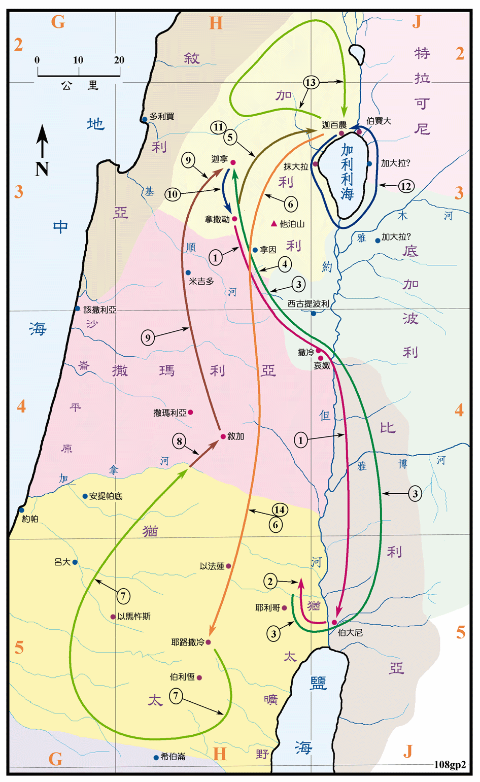 上图:耶稣受洗、受试探和传道早期:1、耶稣从加利利的拿撒勒来到约旦河东的伯大尼,接受施洗约翰的洗(太三13-17,可一9-11,路三21-22,约一29-34);2、耶稣被圣灵引到旷野(传统认为在耶利哥附近),受魔鬼四十天的试探(太四1-11,可一12-13,路四1-13);3、耶稣回加利利传道,途中收安得烈、西门·彼得、腓力、拿但业为门徒(约一35-49);4、耶稣到迦拿参加婚宴,使水变酒,是第一件神迹(约 2:1-11);5、耶稣第一次去迦百农传道(约二12);6、耶稣去耶路撒冷过逾越节,第一次洁淨圣殿,并与尼哥德慕谈道(约二13-三21);7、耶稣到犹太地居住和施洗(约三22-四2);8、耶稣在去加利利的路上,特意经过撒马利亚的叙加城,在雅各井旁与撒马利亚的妇人谈道(约四3-42);9、耶稣回到加利利,在迦拿医好大臣儿子的重病(约四46-54);10、耶稣回拿撒勒传道被拒(路四16-30);11、耶稣再到迦百农传道(太四12-16);12、耶稣在加利利海边传道,再次呼召西门、安得烈、雅各和约翰跟随祂(太四18-22,可一16-20,路五1-11);13、耶稣到加利利全地会堂传道,名声传遍了叙利亚,许多人从加利利、低加坡里、耶路撒冷、犹太、约旦河外来跟着他(太四23-25,可一35-45,路四42-44);14、耶稣上耶路撒冷过逾越节,在毕士大池治癒瘫痪者(约五1-47)。