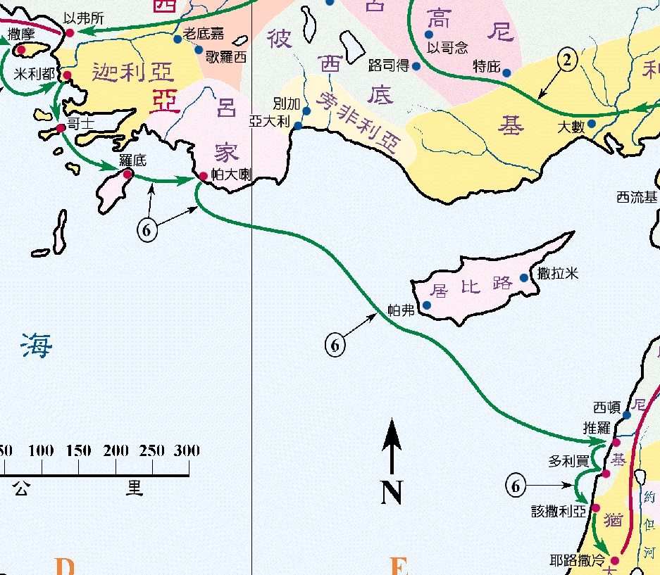 上图:保罗在米利都话别以后,经过哥士、罗底到帕大喇(徒二十一1),在帕大喇换大船横穿地中海到达推罗(徒二十一2-3)。