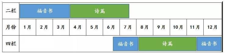 也就是说,第一栏和第三栏在一起是旧约除去诗篇之后的全部书卷,第二栏和第四栏一样都是新约全部书卷加上诗篇。请稍稍留意这里的说明,我们在灵活使用麦琴读经表的时候,可据此作出一些调整。