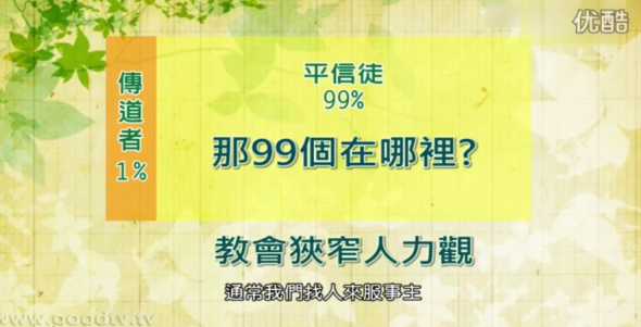 教会通常有两种缺乏:1、人力;2、财务。大部分的服事都落入在1%的传道者身上,但事实上神也要动员99%参与大使命,不管我们有什么专长、才干、甚至是金钱,都可以成为一个祝福的管道,就是为着神福音的缘故,这是神所喜悦的!